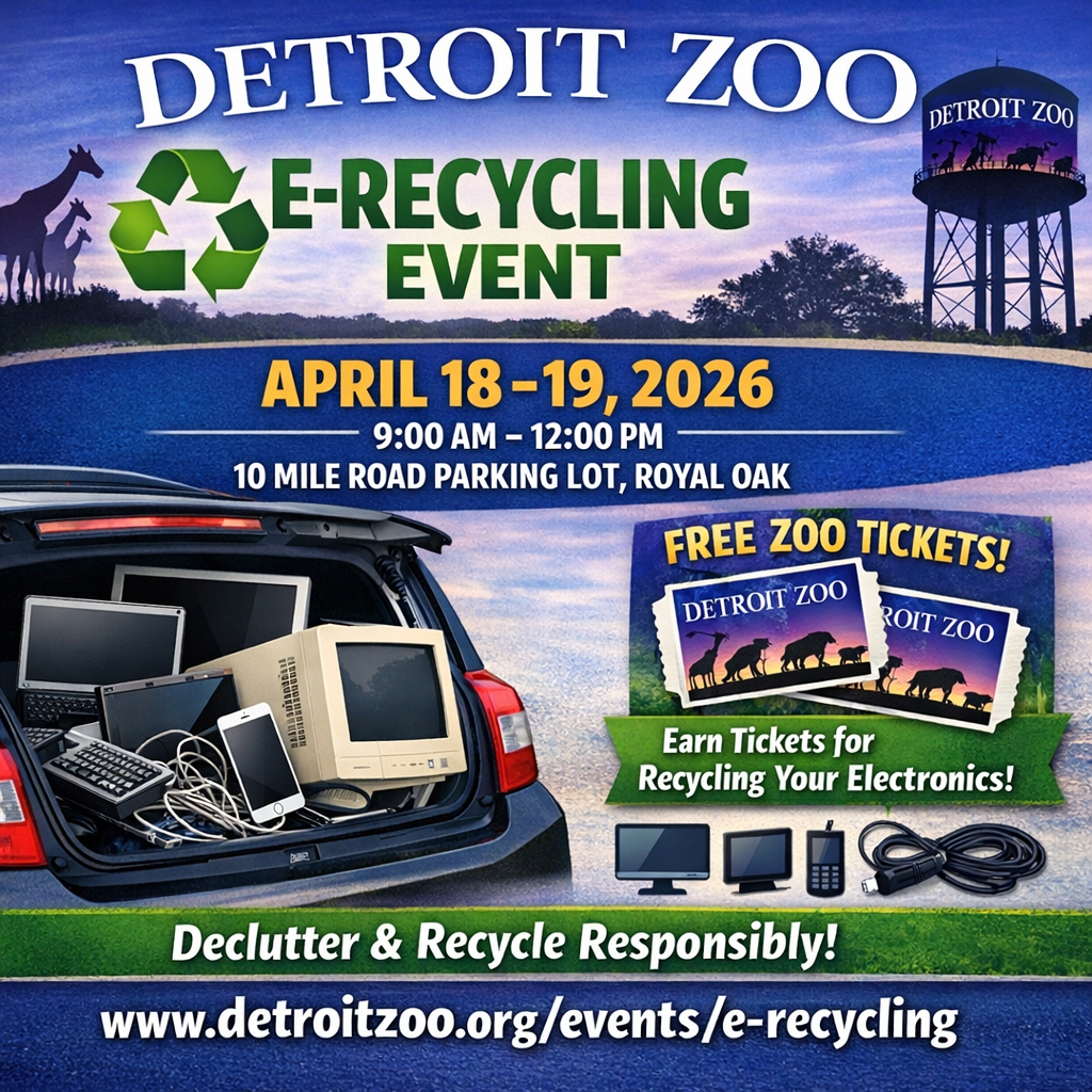 The Detroit Zoo is hosting a free e-recycling event on April 18–19, 2026, from 9:00 AM to 12:00 PM at their 10 Mile Road parking lot in Royal Oak.